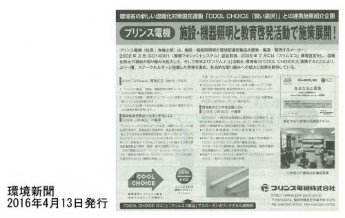 TOP > トピックス > 【パブリシティ】 2016.4.13 環境新聞 照明と教育活動で連携施策