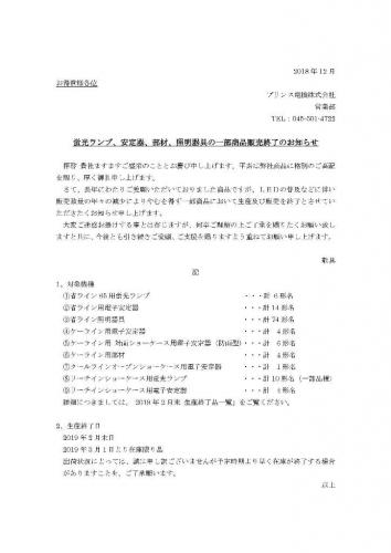 2018年12月 お得意様各位 プリンス電機株式会社 営業部 TEL:045-501-4722 蛍光ランプ、安定器、部材、照明器具の一部商品販売終了のお知らせ 拝啓 貴社ますますご盛栄のこととお慶び申し上げます。平素は弊社商品に格別のご高配を賜り、厚く御礼申し上げます。 さて、長年にわたりご愛顧いただいておりました商品ですが、LEDの普及などに伴い販売数量の年々の減少によりやむを得ず一部商品において生産及び販売を終了とさせていただきたくお知らせ申し上げます。 大変ご迷惑お掛けする事とは存じますが、何卒ご理解の上ご了承を賜りたくお願い致しますと共に、今後とも引き続きご愛顧、ご支援を賜りますよう重ねてお願い申し上げます。 敬具 記 1、対象機種 ①省ライン65用蛍光ランプ ・・・計 6形名 ②省ライン用電子安定器 ・・・計14形名 ③省ライン照明器具 ・・・計74形名 ④ケーライン用電子安定器 ・・・計 4形名 ⑤ケーライン用 対面ショーケース用電子安定器(防雨型)・・・計 6形名 ⑥ケーライン用部材 ・・・計 4形名 ⑦クールラインオープンショーケース用電子安定器 ・・・計 1形名 ⑧リーチインショーケース用蛍光ランプ ・・・計10形名(一部品種) ⑨リーチインショーケース用電子安定器 ・・・計 4形名 詳細につきましては、「2019年2月末 生産終了品一覧」をご覧ください。 2、生産終了日 2019年2月末日 2019年3月1日より在庫限り品 出荷状況によっては、誠に申し訳ございませんが予定時期より早く在庫が終了する場合がありますことを、ご了承願います。 以上 |