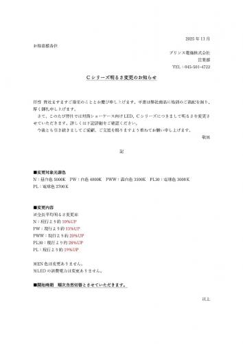 2025年11月 お得意様各位 プリンス電機株式会社 営業部 TEL:045-501-4722 Cシリーズ明るさ変更のお知らせ 拝啓 貴社ますますご盛栄のこととお慶び申し上げます。平素は弊社商品に格別のご高配を賜り、厚く御礼申し上げます。 さて、このたび弊社では対面ショーケース向けLED、Cシリーズにつきまして明るさを変更させていただきます。詳しくは下記詳細をご確認ください。 今後とも引き続きましてご愛顧、ご支援を賜りますよう重ねてお願い申し上げます。 敬具 記 ■変更対象光源色 N:昼白色5000K PW:白色4000K PWW:温白色3500K PL30:電球色3000K PL:電球色2700K ■変更内容 ※全長平均明るさ変更率 N:現行より約10%UP PW:現行より約13%UP PWW:現行より約20%UP PL30:現行より約28%UP PL:現行より約19%UP ※EN色は変更ありません。 ※LEDの消費電力は変更ありません。 ■開始時期 順次自然切替とさせていただきます。 以上 |