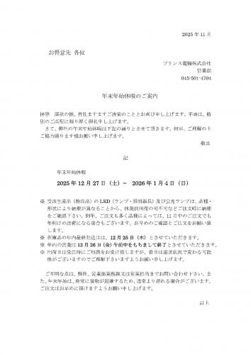 2025年11月 お得意先 各位 プリンス電機株式会社 営業部 045-501-4704 年末年始休暇のご案内 拝啓 深秋の候、貴社ますますご清栄のこととお喜び申し上げます。平素は、格別のご高配に賜り厚く御礼申し上げます。 さて、弊社の年末年始休暇は下記の通りとさせて頂きます。何卒、ご理解の上ご協力賜ります様お願い申し上げます。 敬具 記 年末年始休暇 2025年12月27日(土)~ 2026年1月4日(日) ※受注生産品(特注品)のLED(ランプ・照明器具)及び蛍光ランプは、品種・形状により納期が異なることから、休業前出荷の可不可などご注文時に納期をご確認下さい。例年、ご注文も多く品種によっては、11月中のご注文でも年明けの出荷になる場合もございます。お早めのご確認とご注文をお願い致します。 ※在庫品の年内最終発送日は、12月25日(木)とさせていただきます。 ※年内の営業は12月26日(金)午前中をもちまして終了とさせていただきます。 ※出荷日は受注時にご相談をお受け致しますが、着日は運送状況で変わる可能性がございますのでご理解下さいますようお願い申し上げます。 ご不明な点は、弊社、営業部業務課又は営業担当までお問い合わせ下さい。また、年末年始は、非常に貨物が混雑するため、通常より遅れる場合がございます。ご注文はお早めに頂けますようお願い申し上げます。 以上 |