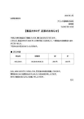 2026年2月 お得意様各位 プリンス電機株式会社 営業部 Tel:045-501-4722 【製品カタログ 正誤のお知らせ】 平素より弊社製品をご愛顧いただき、誠にありがとうございます。 このたび、製品カタログ(2026年2月発行版)におきまして、一部製品の定価表記に誤りがございました。 下記のとおり訂正させていただきます。 ■ 訂正内容 製品名 HCL20AV 記載頁 36,38,40,46,66,72 誤:250円 正:320円 なお、WEBカタログにつきましては、訂正後の内容を掲載しております。 関係各位にはご迷惑をおかけしましたことをお詫び申し上げます。 何卒ご確認のほどよろしくお願い申し上げます。 以上 |